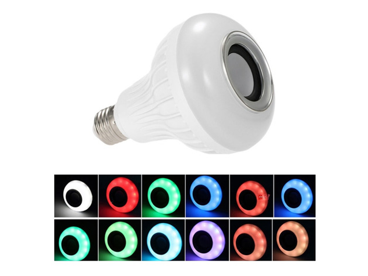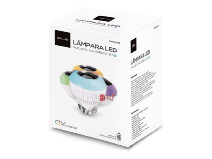 Ampolleta led con 16 colores y parlante incluido, puedes controlar los colores con el control remoto que viene incluido. Además trae bluetooth incorporado para escuchar música desde tu celular ya sea iPhone, Android o todo dispositivo bluetooth.